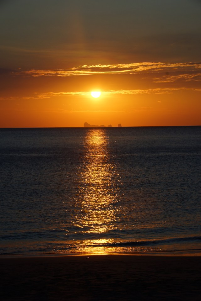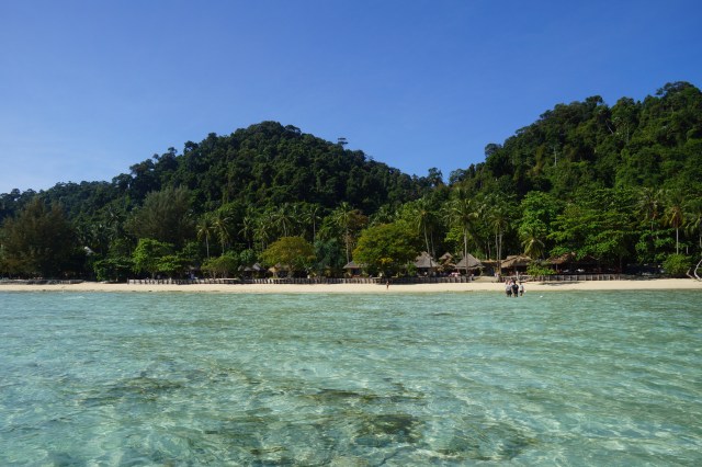 Turen til Koh Ngai tog kun en halv time med speedbåd. Den lille ø var kun 4 x 2 km. Livet på øen var koncentreret omkring en østvendt strand, hvor der lå 7 små resorts. Vi skulle bo på Thapwarin, der var det næstsidste resort på stranden. Her havde vi booket en hytte, der lå i sandet i første række, hvilket betød havudsigt fra sengen. Herfra kunne vi nyde en virkelig flot horisontlinie med små klippeøer, der stak op af det blå hav.
